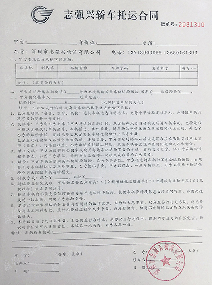 關(guān)于轎車托運(yùn)合同,大家有幾點(diǎn)需要注意的:1、是否蓋有托運(yùn)公司的公章,有公章才有法律效應(yīng)。2、是否記錄車輛相關(guān)情況,車內(nèi)攜帶的物品、公里數(shù)、油量、車輛外觀。3、是否寫明價(jià)格以及支付方式,避免被多次收費(fèi)或隱性收費(fèi)。4、當(dāng)然車內(nèi)是不能放置任何違禁物品